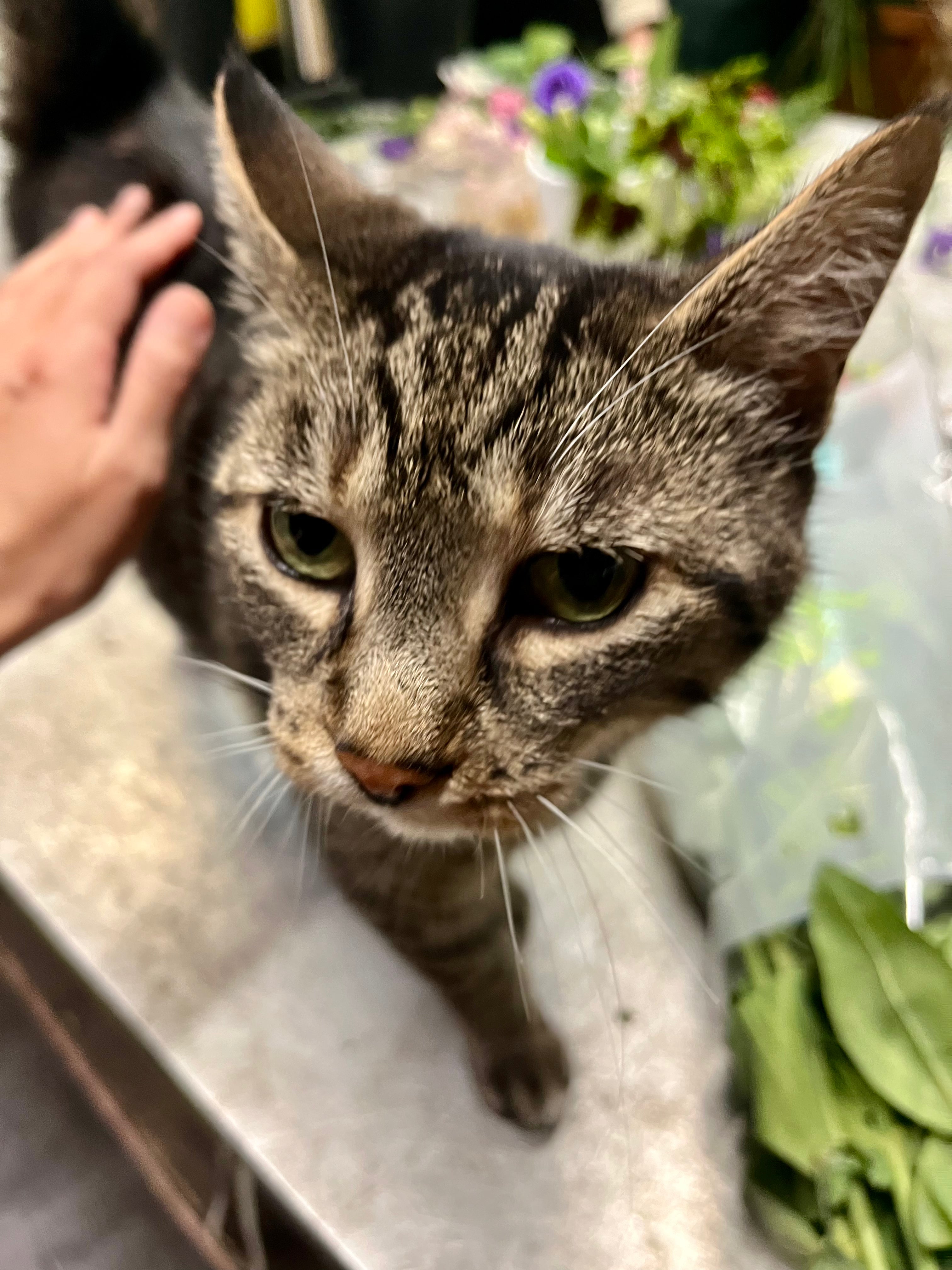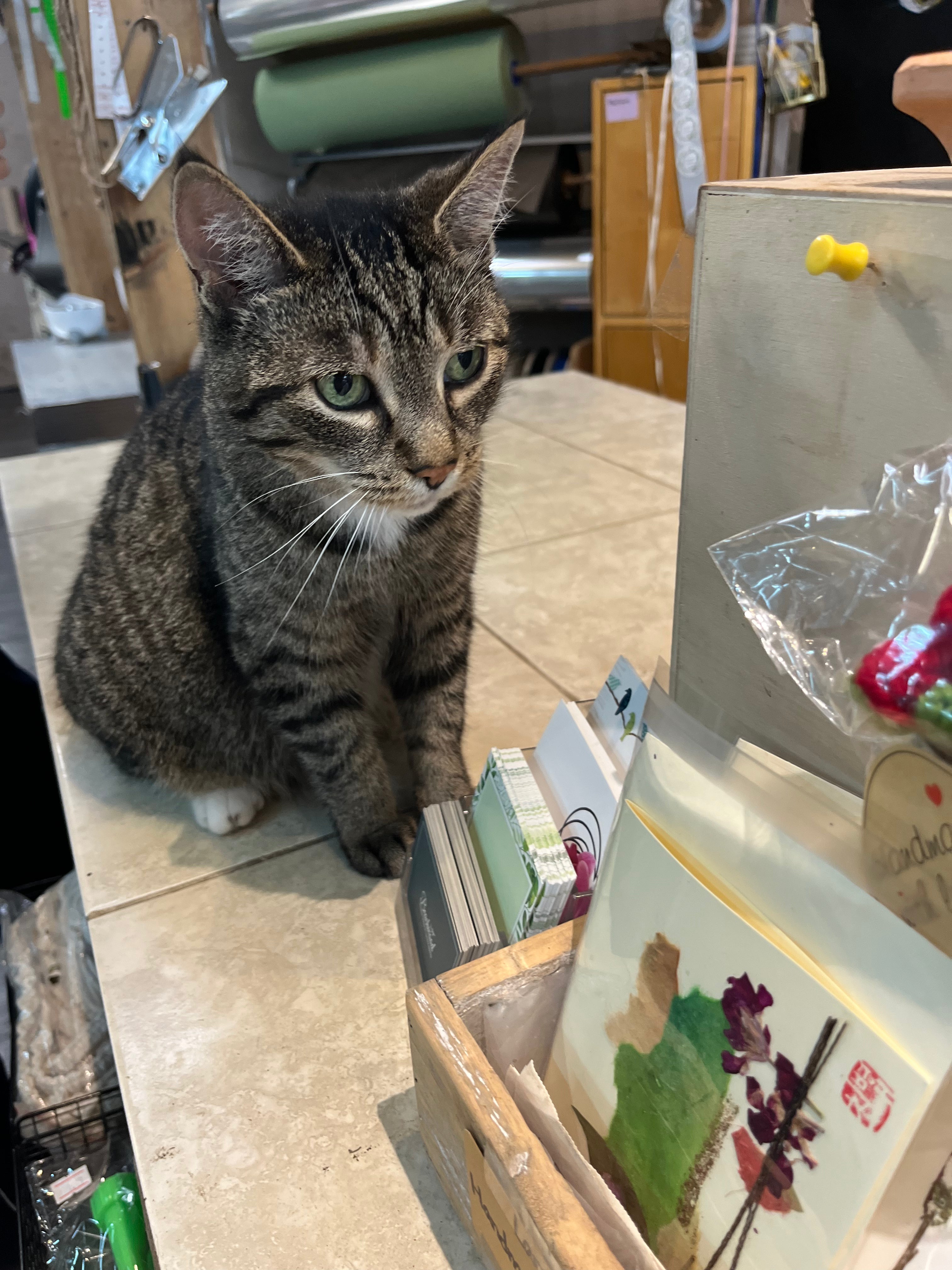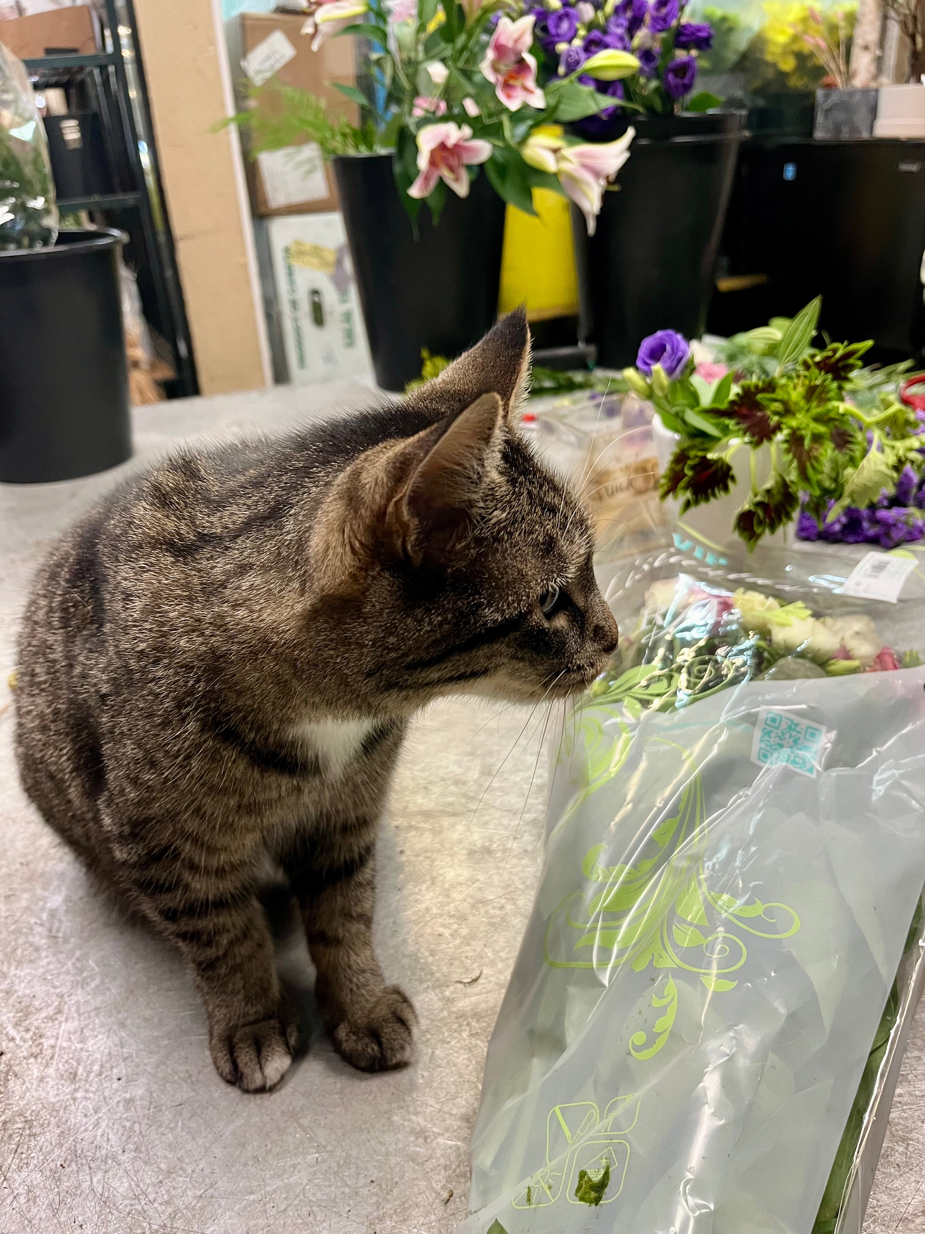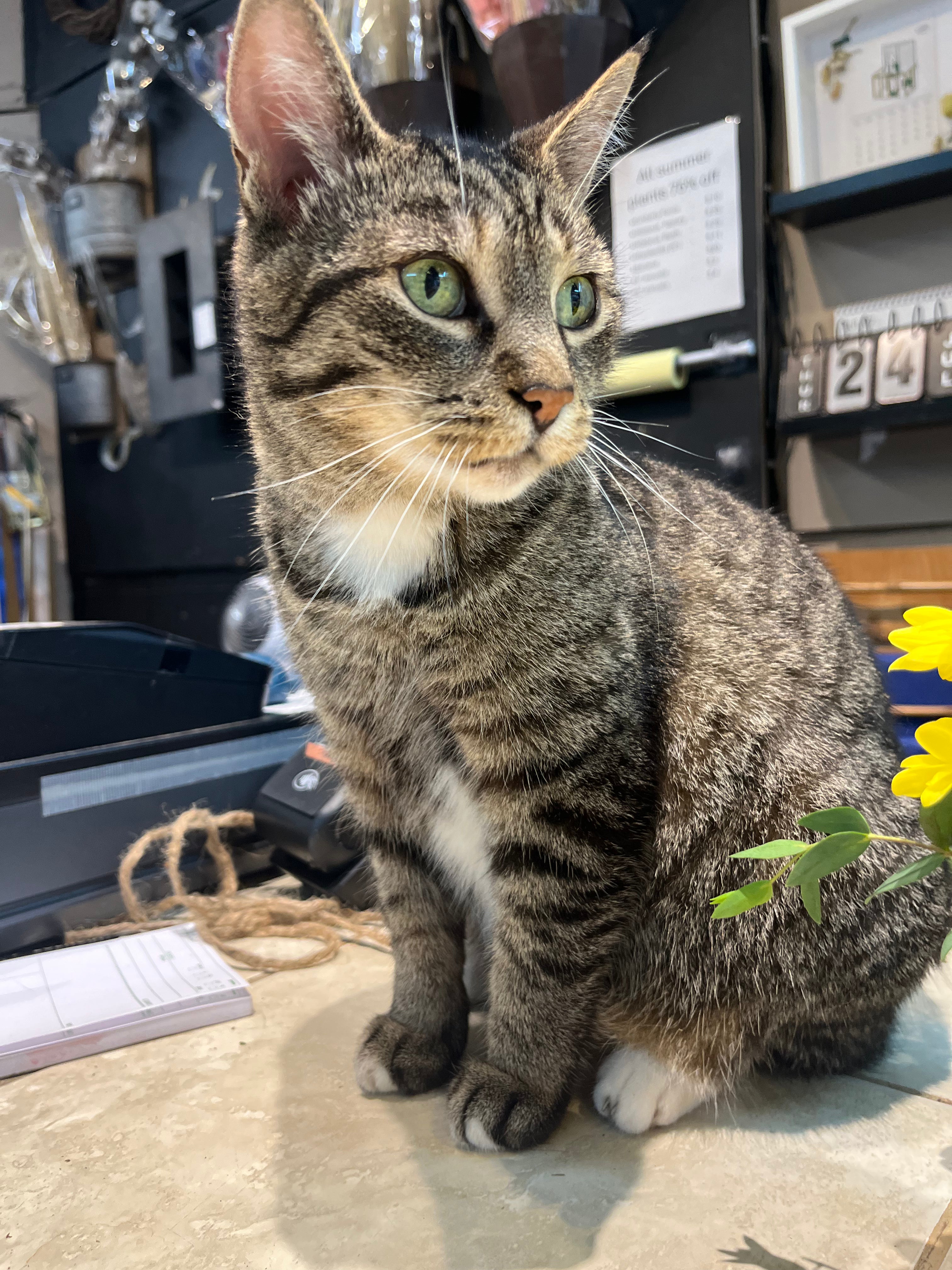 As our official Shop Manager, Doris takes her role seriously. She never, ever touches the merchandise. Instead, she prefers to sit a little distance away, casting a watchful, discerning eye over all the beautiful blooms and ensuring everything is in its proper place. Her silent inspections are legendary!